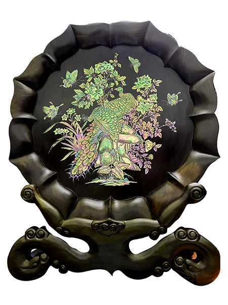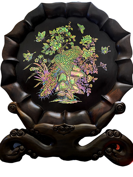 Đĩa gỗ trắc khảm phu thê viên mãn được cưa cắt, đục gắn, tỉa tách thổi hồn